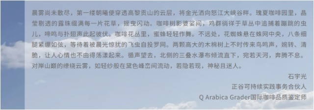 当瑰夏咖啡成为生活的风味,伴随温热的琥珀色液体滑入喉间,你喝到的不仅是一杯瑰夏,也是高黎贡山的云雾、咖啡园里的鸟鸣、以及被清晨的露珠、草下的苔藓滋养着的泥土与花草树木交织凝结的芬芳,更是我们对Our Planet,Our Future的坚定期许。